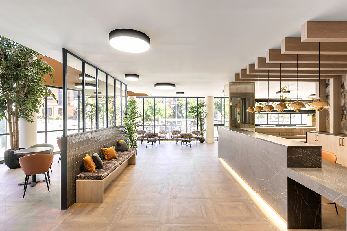 El mobiliario combina mesas y taburetes altos con butacas y bancadas de madera, todas tapizadas con textiles en tonos mostaza, grises y estampados florales. Las barras, con superficies de porcelánico ultracompacto y cautivadoras vetas anaranjadas, se complementan con elegantes lámparas en tono dorado.